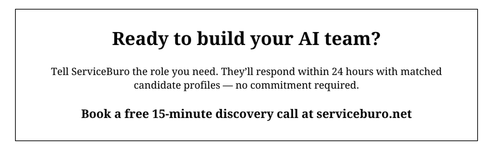 The companies pulling ahead in their industries aren't waiting for AI to mature. They're building AI capability now, with the talent to match. The barrier used to be cost, speed, and compliance complexity. ServiceBuro removes all three.