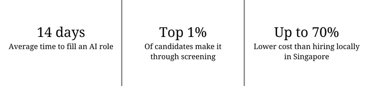 To understand why this matters, consider the numbers. A mid-level AI engineer hired locally in Singapore typically costs SG$7,500 to SG$14,000 per month in base salary alone — before CPF contributions, benefits, recruitment fees, and office overhead. Senior specialists in fintech or deep learning command even more.