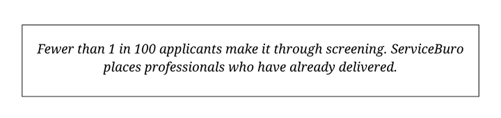 Every candidate goes through a rigorous multi-stage screening process. Fewer than 1 in 100 applicants make it through. ServiceBuro doesn't place candidates who look good on paper — it places professionals who have already delivered in real-world AI environments.