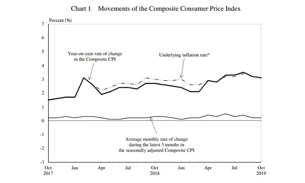 For 10M 2019, Composite CPI rose 2.9% YoY. The inflation rate was at 3.3% YoY for the three months ending October and 2.8% for the 12 months ending the same month.