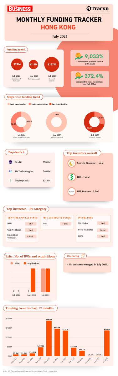Hong Kong startup funding jumped 9,033% month-on-month and 372.4% year-on-year to $137m in July, Singapore Business Review and Tracxn reported.