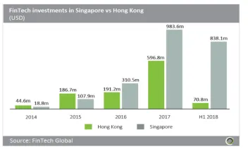 Total fintech funding hit US$983.6m in 2017 versus Hong Kong's US$596.8m.